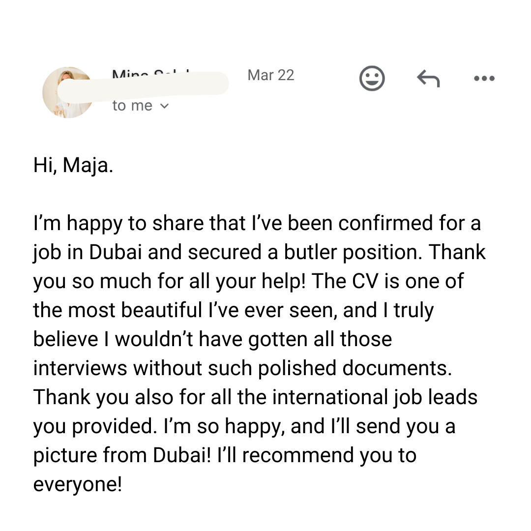A future butler in Dubai applied the system, optimized her LinkedIn, and within 46 days was hired for €60,000/year with her own apartment, car, visa, and bonuses.